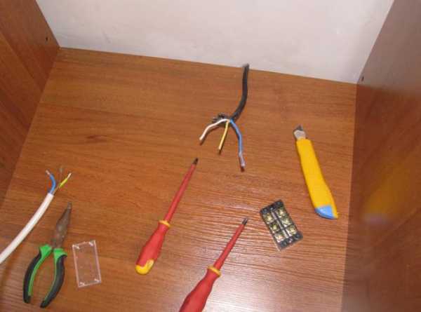 Шаг 1. Сначала необходимо отрезать выведенный из подрозетника кабель на удобную для монтажа длину. Поскольку провода ВВГ жесткие, то лучше оставлять концы длиной от 10 см.