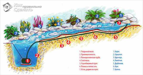 При сооружении такой горки необходимо придерживаться всех вышеописанных рекомендаций. Для водоема понадобится емкость. Можно приобрести специальную, с кармашками для размещения растений. Однако для создания озера неплохо подойдет старая ванна, огромный таз. Иногда применяют специальную пленку, расстилая ее по дну.