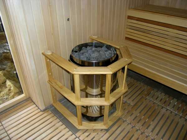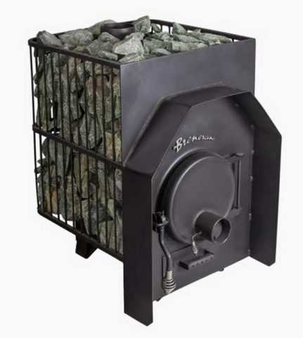 Большинство застройщиков делает подобную перегородку из кирпича, что надо учесть при проектировании фундамента сауны, поскольку такая перегородка будет достаточно тяжёлой. Сейчас для бани есть большой выбор как дровяных печей, так и электрокаменок. В моём варианте исходя из размеров парилки (у меня — 6 м3) нужно было выбрать печь минимальной мощности, но способную поднять в режиме сауны температуру до 120°С. Есть правило, что мощность печи надо выбирать из расчёта 1 кВт мощности печи на 1 м3 объёма парилки. Я установил дровяную печь «Тонус» (аналог «Харвии») мощностью 8 кВт. Кроме того, конструкция этой печи позволила без большой переделки положить среди камней засыпки изогнутую трубузмеевик, в которой происходит подогрев воды, самотёком поступающей из бака. В этом баке, чтобы летом можно было бы принять тёплый душ без протопки парилки, установлен воду до температуры около 45°С, затем автоматически отключается. Перед пользованием душем электропитание ТЭНа нужно отключить двухполюсным выключателем (что соответствует требованиям электробезопасности).