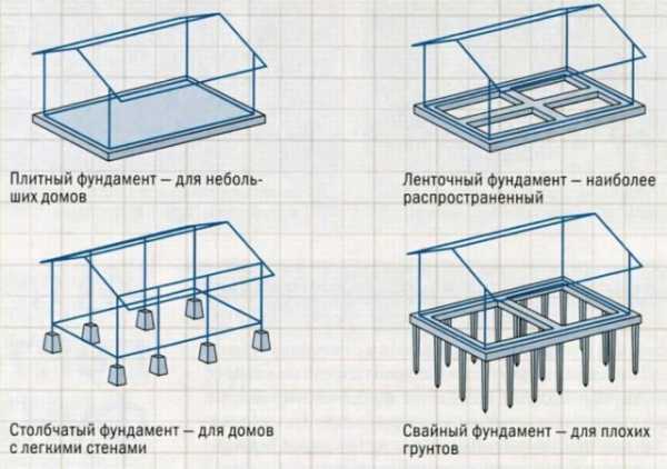 Для строительства бани, используют несколько видов фундамента. В зависимости от веса стен и особенностей почвы, изготавливают фундаменты следующих видов:
