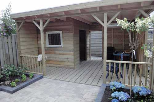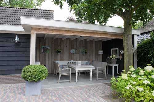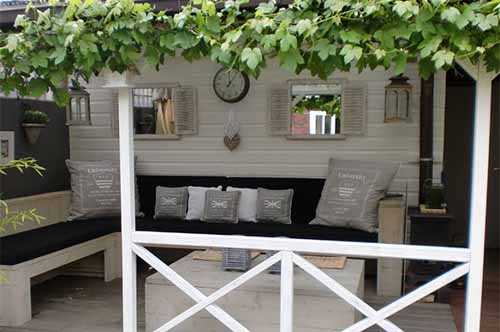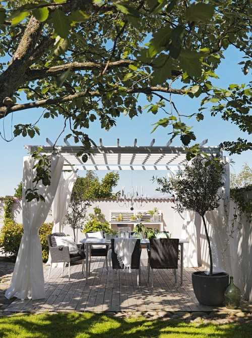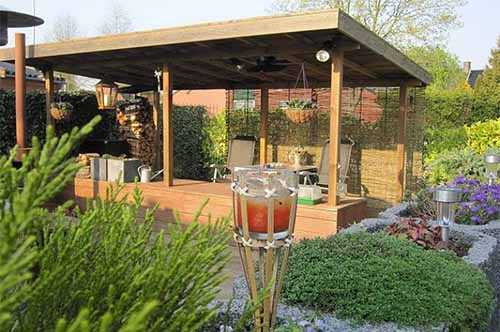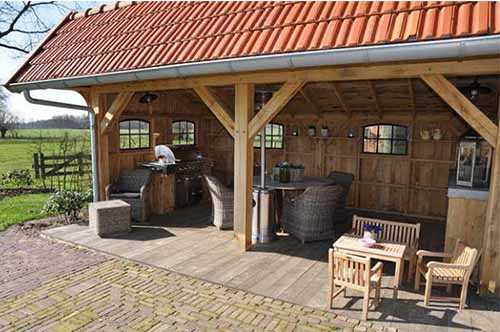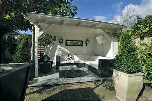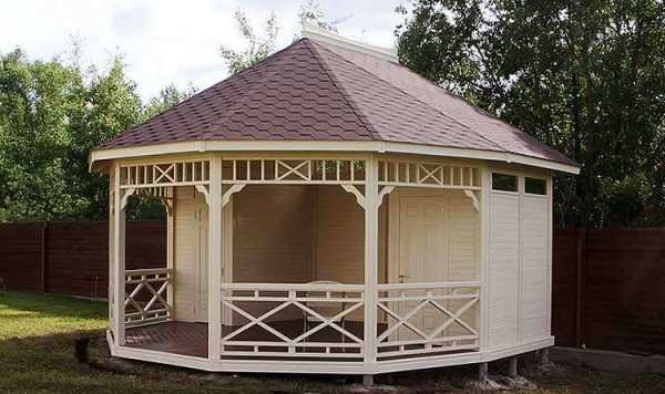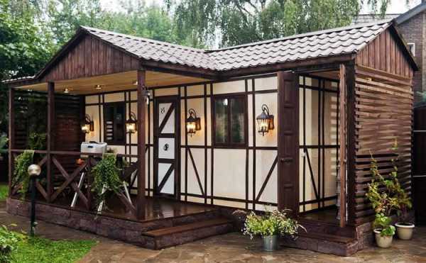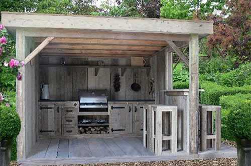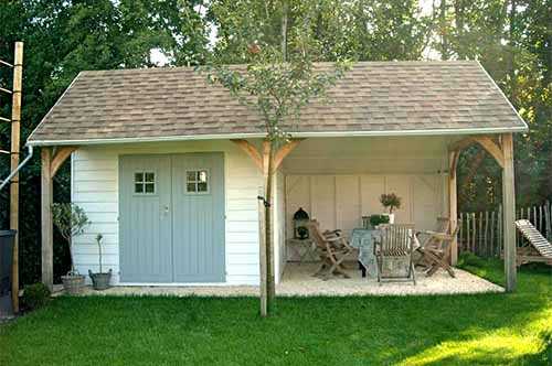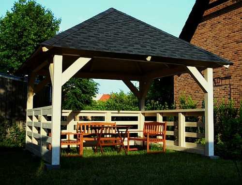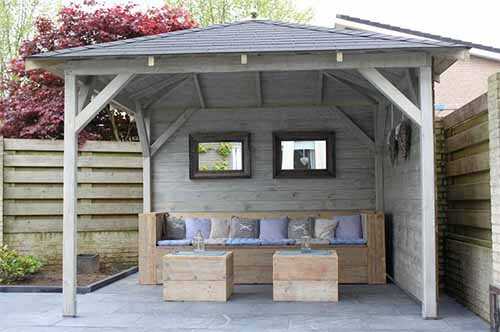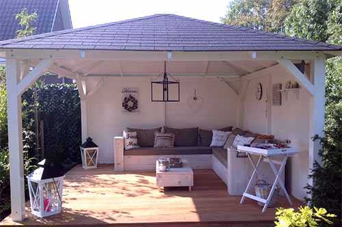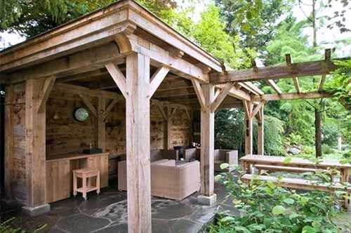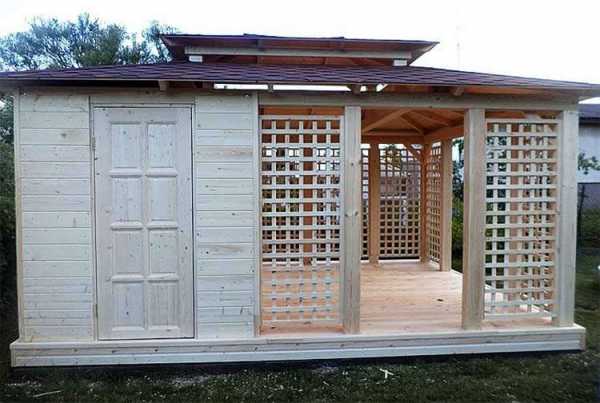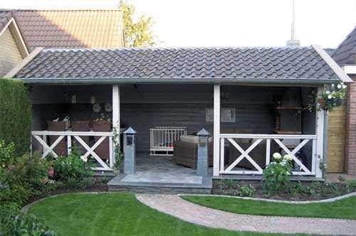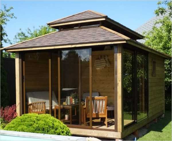 Это не только место для отдыха, но еще и подойдёт для мастерской, когда идёт дождь. Такая конструкция очень удобна для маленьких участков.