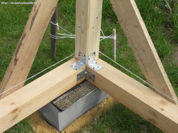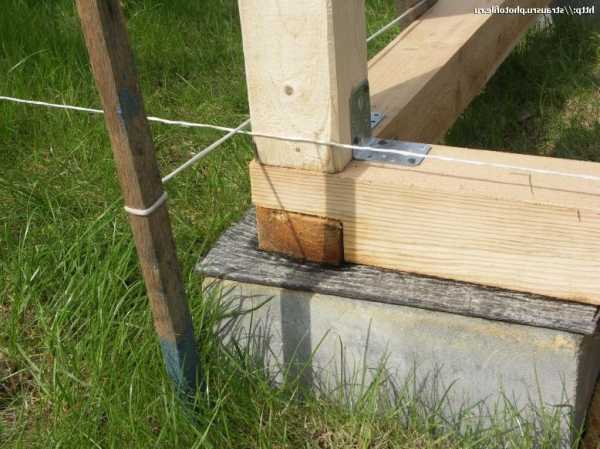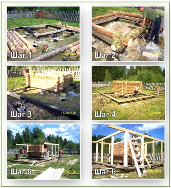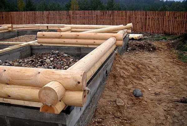 Если используется брус, то сначала фундамент «обвязывается» брусом, поверх которого укладывается рубероид. Далее брусья укладываются рядами и соединяются при помощи нагелей.