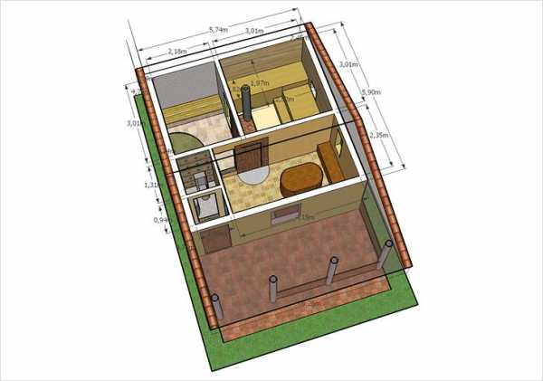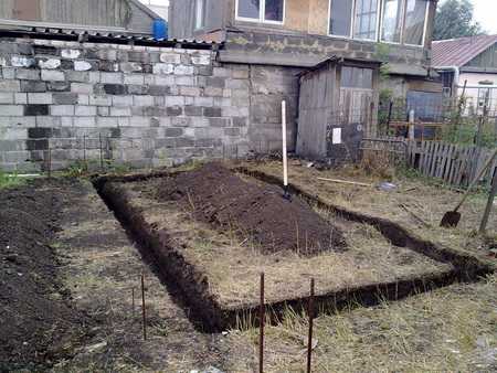 Первый шаг. Выройте котлован глубиной около 60 см. Другие габариты ямы определяйте в соответствии с размерами будущей бани.