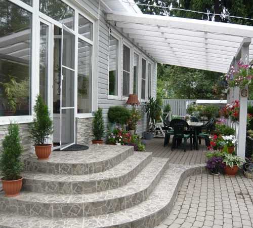 После отделки крыльца, на нем устанавливают перила, в том случае, если количество ступеней на нем более трех. Для предотвращения попадания атмосферных осадков к входной двери, рекомендуется установить козырек. Вариантов его сооружения масса — кирпич, штучный камень, металл, дерево, поликарбонат.