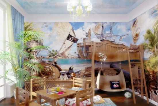 Юным капитанам снится бескрайняя гладь моря, дальние плавания, бури и ураганы, загадочные острова. Комнату для мальчика или для двух мальчиков можно замечательно обустроить в морском стиле – стены выкрасить в небесно-голубой цвет или светло-голубой. Мебель купить в стиле яхты – под натуральное дерево, стилизованные канатами, якорями. Деревянными реечными можно сделать даже стены, получится настоящая яхта.