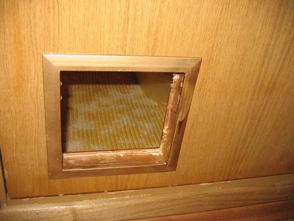 Полотно снимается с коробки и укладывается на ровную поверхность. Размечается квадрат будущего лаза и в одном угле просверливается отверстие, в которое свободно пройдет полотно электрического лобзика. Дальше останется только разрезать материал по отметкам и удалить ненужную его часть. В конце торцы среза шлифуются наждачной бумагой и покрываются лакокрасочными материалами, чтобы защитить от повреждений, грязи и влаги. Для украшения можно сделать рамку вокруг выреза из реек по типу наличников.