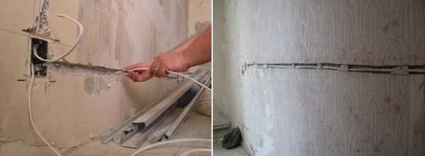 Проложенные провода закрепляются густым алебастром. Этот материал оптимален, так как быстро высыхает, а при необходимости его можно быстро удалить и вытащить шнур.