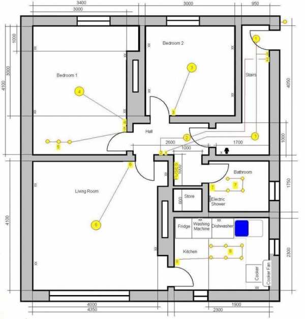 - Пути прокладки кабелей. Указывая их на своем чертеже, помните, что проводка должна идти строго вертикально либо горизонтально, никакие зигзаги не допускаются. Если планируется укладка проводов вовнутрь стен, то следует отступать от перекрытий и проемов 15 – 20 см.
