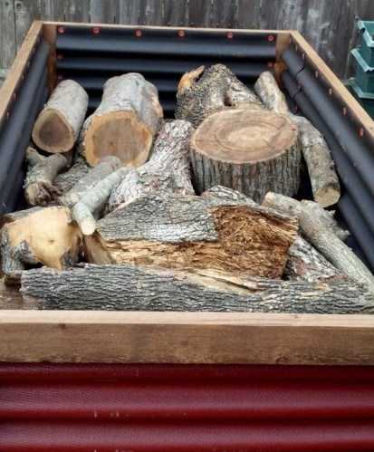 На фотографии вы видите довольно интересный пример того, как именно следует изготавливать питательную природную грядку, со стенками из шифера или ондулина. Но в в ней же, а не в самих стенах заключается ее главное преимущество. В частности, в том, что находится внутри нее — питательная среда для высаживаемых растений. Дерево, находящееся под слоем грунта, будет вбирать в себя излишнюю влагу, а потом отдавать ее по мере высыхания грунта. Кроме этого, древесина будет постепенно разлагаться, и давать, таким образом, питательные вещества. Данную грядку вы может реже поливать. Мы еще называем такие грядки — ленивыми. Кроме этого, данные грядки очень теплые, поскольку происходит процесс ферментации органики. Отсюда следует, что урожай в очень холодные годы будет существенно выше именно за счет подогрева грунта.