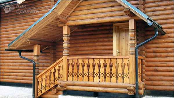 По желанию можно установить деревянные перила для крыльца. После того, как все детали установлены и закреплены, можно приступать к декоративной отделке деревянного крыльца.