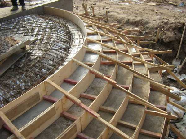 Монтируется изогнутая опалубка к каждой ступени. Для прочности устанавливаются подпорки. Главное – чтобы вся конструкция выдержала вес бетонного раствора. В опалубку укладывается арматура и заливается бетон. Для большей плотности он обрабатывается виброустановкой, после чего все разравнивается правилом и оставляется затвердевать.