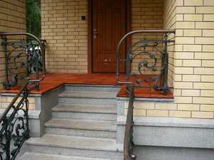 Чтобы бетонное крыльцо выглядело красиво, делают перила и козырёк. Перила можно не устанавливать, если лестница короткая. Материал для перил можно использовать разный, главное, чтобы он совпадал с общим дизайном здания.