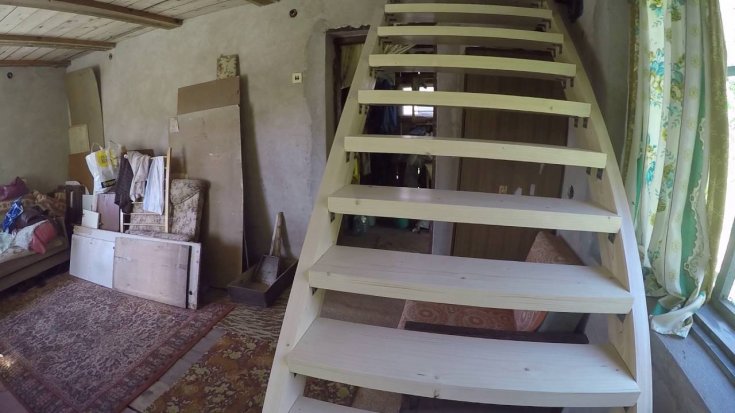 Вот, пожалуй, и вся инструкция по изготовлению лестницы. Следует отметить, что также можно сделать ее на основе косоуров, в результате чего конструкция будет выглядеть еще более привлекательно. Однако, на ее изготовление уходит больше времени, так как в досках необходимо выполнить вырезы для ступеней.