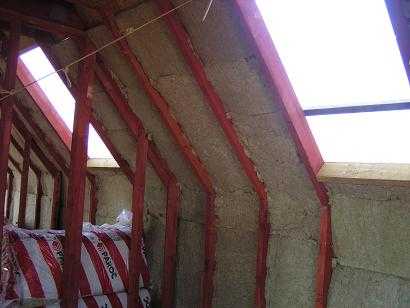 Теплоизоляция мансардной крыши, чаще всего, устанавливается внутри помещения. Для этого укладывают теплоизоляционный материал, который прикрепляется к стропилам проволокой.