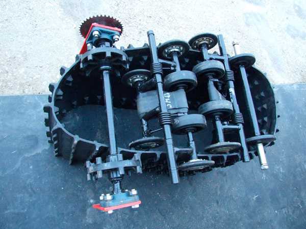 Валы гусеничного блока — части составные: собираются из вала, втулок, и подобранных подшипников. Внутренний диаметр выточенных втулок должен соответствовать внешнему диаметру подшипника, а толщина стенок втулок должна быть толщиной 5mm. Ведущим следует выбрать задний вал, так как на него нагрузка больше. Исходя из этого, на задний вал навариваем приводную звездочку. На валах крепятся флянцы, на которые, в свою очередь, устанавливают колеса гусеничного блока.