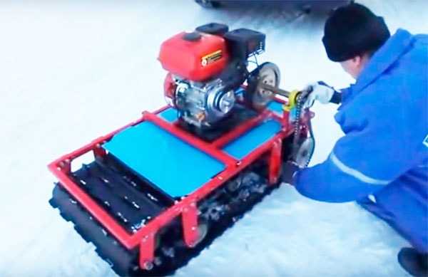 Самодельный буксировщик обычно оснащается карбюраторным двигателем от мотоцикла или бензопилы. В качестве движителя используется гусеница с катковой или склизовой подвеской.