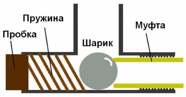 - Во внутреннее резьбовое отверстие тройника вкручивается муфта. Делается это таким образом, чтобы она приблизительно на 2 мм перекрыла боковое отверстие. Выполнить такое требование при закручивании муфты необходимо для того, чтобы шарик, который будет располагаться во внутренней части тройника, не выскочил в его боковое отверстие.