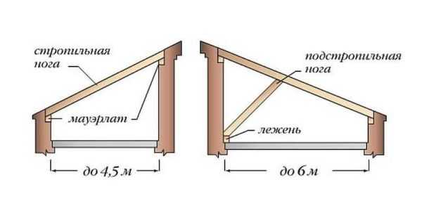 - При расстоянии между стенами от 4.5 до 6 метров – с укреплением стропил треугольными подкосами;