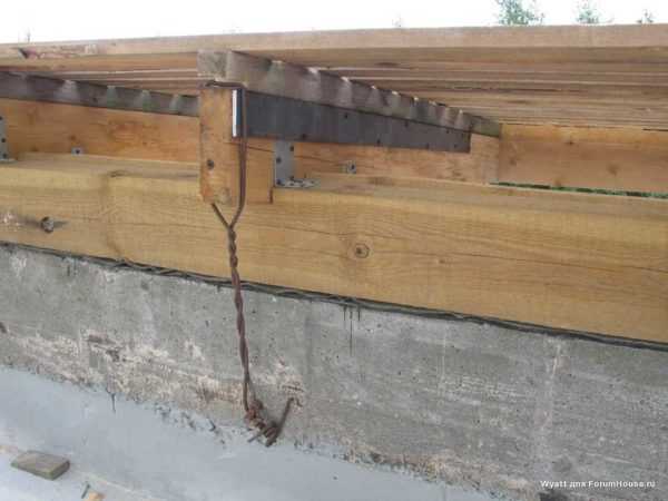 Вся стропильная система устанавливается на мауэрлат — это основной элемент крыши. Делают его так: берутся брусья и монтируются на поверхность несущих стен. Крепление можно выполнять при помощи анкеров или проволоки. Для деревянных домов используются скобы. В стыковочных местах прибиваются уголки и металлические пластины.