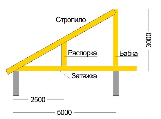 Если постройка небольшая, то можно фермы не собирать. Для этого по фасаду строения на мауэрлат устанавливаются вертикальные короткие стойки с шагом, равным расчетному расстоянию между стропилами. К нему они и крепятся металлическими уголками. Их длина определяет наклон крыши. Между собой стойки связывают поперечным брусом, который укладывают на торцы стоек. К ним же и крепят. То есть по фасадной стене собирается ферма, прямоугольной формы, как опора для концов стропильных ног.