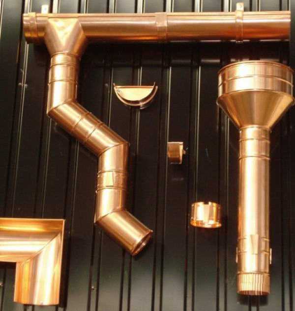 - Медные. Для изготовления таких водоотливов используется листовая медь, на которую нанесено защитное покрытие. Среди преимуществ таких изделий можно отметить долговечность, а также внешний вид. Но медные водоотливы самые дорогие.