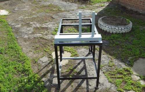 Изготовление следует начинать из каркаса-рамы, размеры которой должны быть 40 на 60 на 120 сантиметров. Материалом для рамы служит уголок №25, нарежьте болгаркой заготовки и сварите. Сварив раму, необходимо приварить к ней ножки из уголка или того же профиля. Сверху приварите к столу швеллер №10, который выполняет функцию направляющей и укрепляет раму и само собой всю конструкцию. К нему крепятся болтами две вертикальные стойки.
