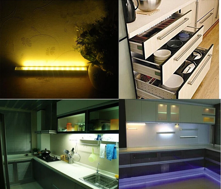 Встраиваются в дно шкафов, создают уютную атмосферу. Однако монтажные работы могут вызвать затруднения, поскольку придется вмешиваться в конструкцию шкафчиков;