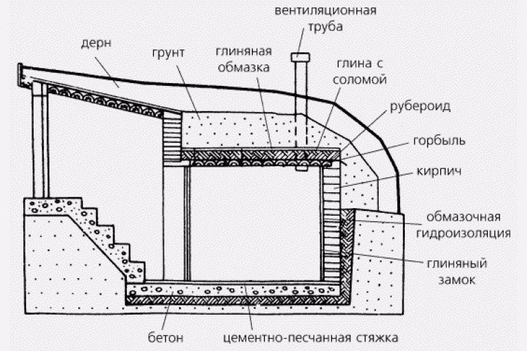 Оптимальный вариант — погреб с каменными или кирпичными оштукатуренными сводами. Глиняный пол засыпают гравием или речным песком, который в жаркие дни увлажняют. На влажном грунте делают бетонный пол.