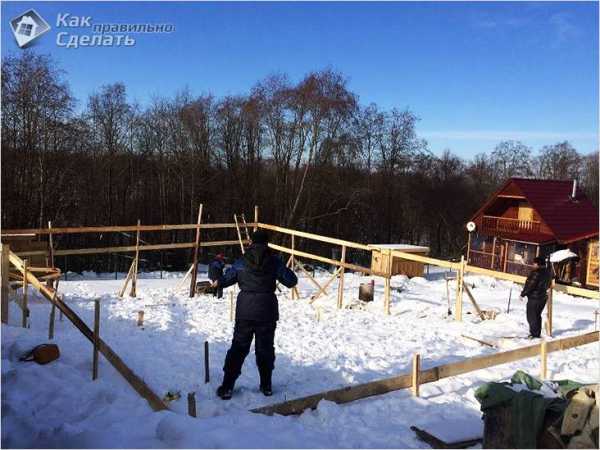 - Потом на высоту двадцати сантиметров заливается фундамент.