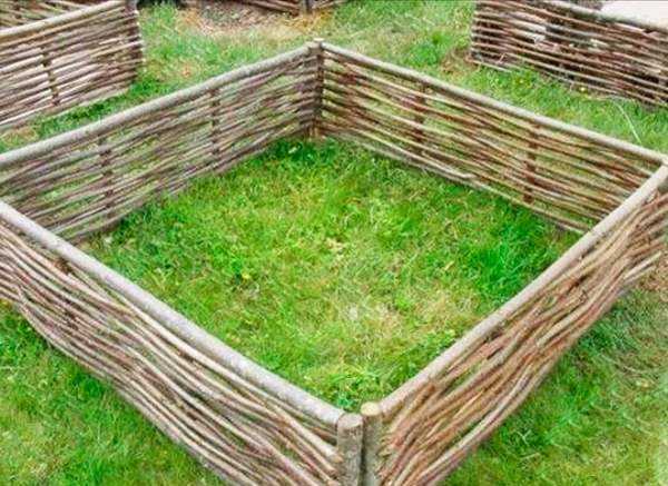 Прутья и лоза – оригинальный, дешевый материал. Сплетенные стенки высоких грядок привлекательно выглядят, а форму самой грядки можно сделать любую.