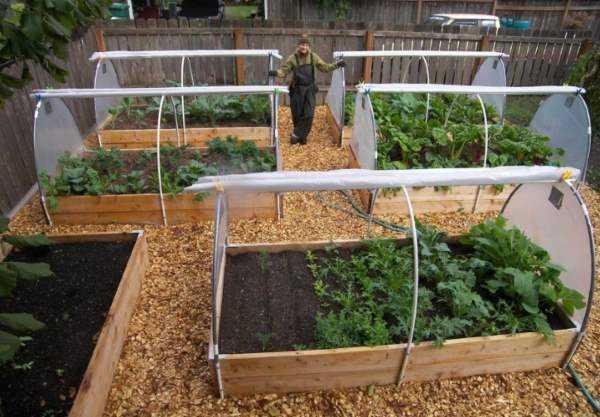 - ящики-грядки легко превратить в мини-теплицы, дооборудовав их пленочным укрытием на пластиковых или металлических опорах.