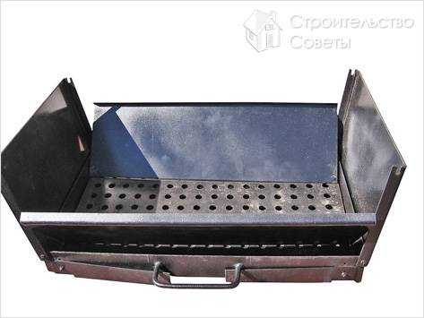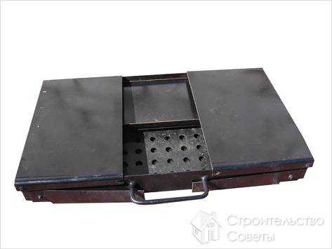 Эта конструкция предполагает собственноручное сооружение не только переносного разборного мангала, но и такого, который в собранном виде представляет собой сложенный чемоданчик, снабженный удобной ручкой для транспортировки. Внутри этого чемодана должны будут умещаться шампуры для шашлыка и решетка для гриля. Такой мангал очень удобен для транспортировки.