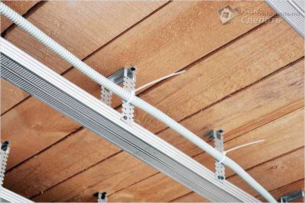 Если планируется установка встроенных светильников, то проводку следует осуществить до монтажа потолка.