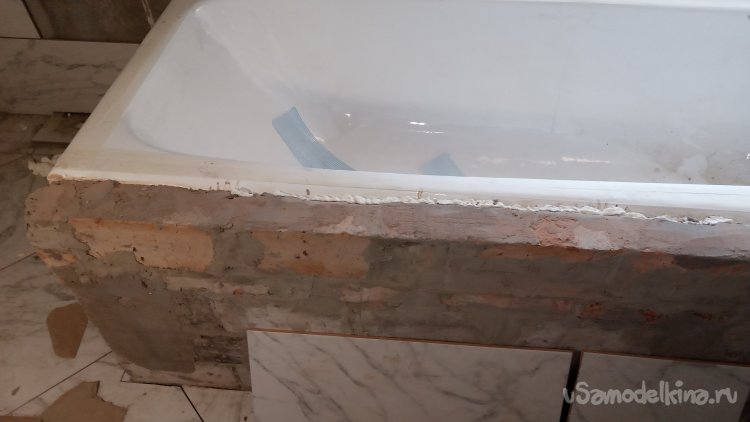 Чтобы места входа саморезов были незаметными, рекомендуется их закрывать специальными заглушками, окрашенными в тон ванне. Также, можно соорудить экран из кирпича, правда сначала следует изготовить сам экран, а уже потом устанавливать ванну поверх него.