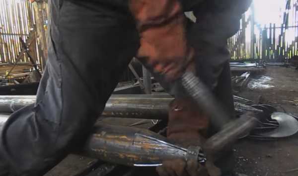 Шаг 4. Резкими ударами молотка сгибайте розочки к центру трубы. Удары должны быть сильными, с опытом придет понимание, каким образом металл реагирует на усилия. Все треугольники сгибайте по очереди, прилагайте усилия, чтобы они более-менее равномерно приближались к центру.