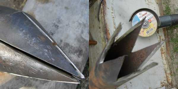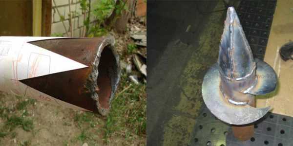 В первых двух случаях наконечник образуют 4-6 треугольных сегмента, вырезанные болгаркой из листового металла толщиной 4-5 мм или нарезанные в виде короны в нижней части трубы. Из этих сегментов нужно сформировать конусы в виде равнобедренной пирамиды, операция производится сваркой по прихваткам.