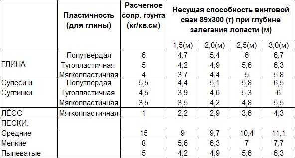 Таблица несущей способности винтовых свай диаметром 89 мм