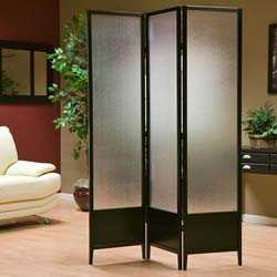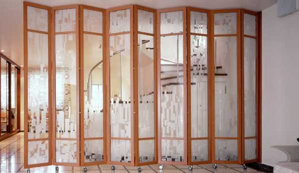 - Стекло. Оно может использоваться двояко – можно изготовить полностью стеклянную ширму, а можно применить этот материал исключительно для вставок в раму. Как правило, прозрачная ширма своего функционального назначения не выполняет, именно по этой причине стекло обычно оклеивается декоративной непрозрачной или полупрозрачной пленкой. Полностью стеклянную ширму изготовить в домашних условиях практически невозможно – разве что заказать изготовление ее частей на заводе, а дома выполнить только сборку изделий.