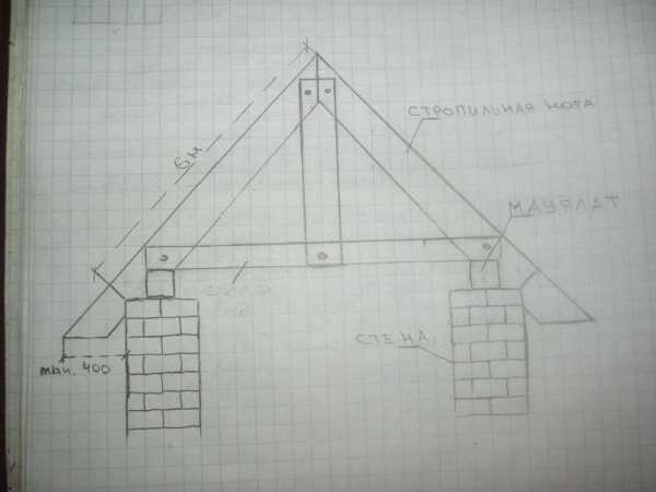 Если же крыша вашего дома позволяет использовать брус, длины которого хватает и на свес — такой вариант тоже хорош. Как в этом случае вырубать стропила («зарубать пятку») относительно стен дома и мауэрлата показано на рисунке.