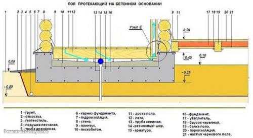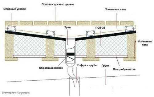 - Протекающая конструкция (если пол бетонный). Черновая основа пола заливается в форме воронки, которая заканчивается канализационной трубой. Сверху укладываются доски, которые имеют зазоры для оттока воды. Через них вода попадает в канализационную систему и уходит.