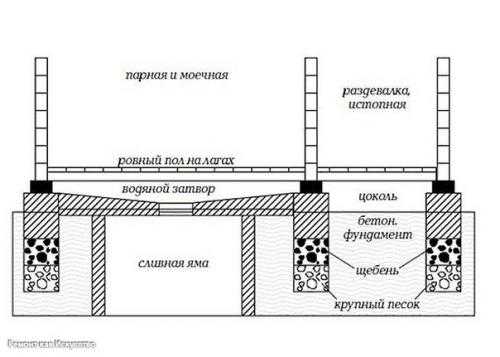 Так как на пол в бане попадет много воды, необходимо организовать правильно ее отведение и думать об этом надо еще во время заливки фундамента. При проведении строительства на песчаном грунте, можно просто сделать сливную яму под моечным помещением, дно которой заполняют крупным щебнем. Для отвода неприятного запаха в фундаменте делают отдушины.