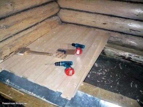 Первый вариант подразумевает укладку деревянных лаг, на которые настилаются доски. Конструкция может быть демонтирована, подремонтирована или просушена на улице.