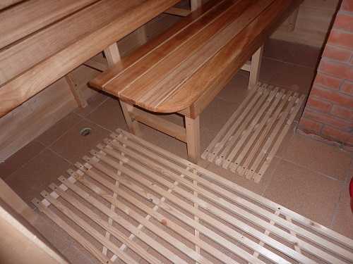 Для пущей безопасности на керамическое покрытие можно деревянные щиты положить. Кроме ребристой устойчивой поверхности, такие щиты предохранят кожу ног от термического ожога, если в парной будет очень высокая температура. Очень ценятся березовые или дубовые щиты из-за целительных и фитонцидных свойств этой древесины.