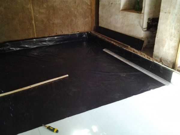 На готовый черновой пол укладывают гидроизоляционный материал с нахлестом полотен не менее 10 см, и обязательно проводится герметизация всех швов.