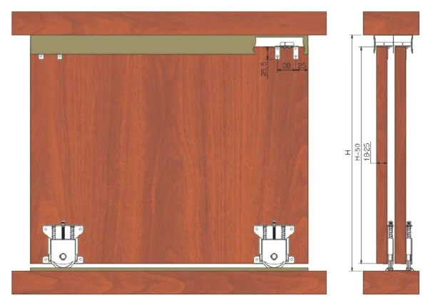 Ставят стопоры. Чтобы завести дверь в верхний и нижний направляющий рельс, ее заводят вначале в верхнюю направляющую, слегка приподнимают, ставят ролики на нижнюю направляющую. Верхняя и боковая часть системы закрывается декоративной панелью, наличником, крепления закрывают декоративными мебельными заглушками.