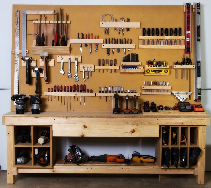 На основании списка видов работ составляем уже 2 других перечня – для требуемого основного и вспомогательного оборудования и оснащения мастерской. В них надо включить все, что должно будет находиться внутри постройки. Всякого рода инструмент (от отвертки и кувалды до дрели и болгарки), метизы, крепеж, вспомогательную оснастку, мелкие и небольшие заготовки, готовые изделия и тому подобное, а также порошковый огнетушитель и аптечку группируем в первый список, который может быть приблизительным и не очень подробным. Решаем как все это добро будем размещать и хранить. В зависимости от размеров и частоты использования то или иное оснащение из этого списка можно поместить: в шкафы, на стеллажи и полки, повесить на крючья, закрепленные на стене.