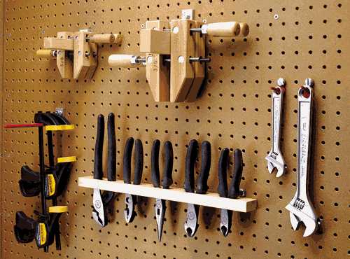 Большинство ручных инструментов принято хранить на настенном щите. Низкая открытая полка под верстаком или поблизости хорошо подходит для хранения ручных электрических инструментов, таких как дрель или дисковая пила. Верхнее ограничение места для хранения инструментов определяется тем, куда вы без затруднения можете достать, а наиболее часто используемые из них следует держать на высоте верстака или над ним, чтобы избегать лишних наклонов.