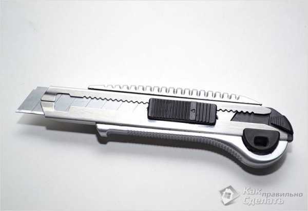 - Производится разрез. В отличие от полиуретана пенопласт – мягкий материал, и его резать можно даже с помощью ножа или лучше – канцелярского или строительного резака. Здесь лучше использовать не большую, но ровную деревяшку, металлическую плашку или линейку. В крайнем случае можно сделать отметки карандашом, соответствующие прорезям стусла, соединить их с помощью линейки – и вести прорез.
