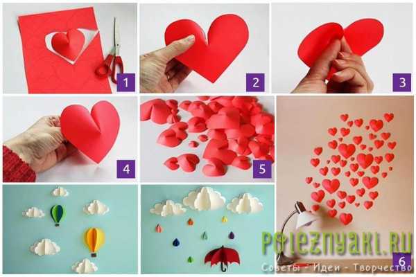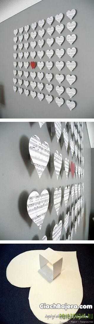 Чудесные сердечки, вырезанные из цветной бумаги, фотографий и нотных записей