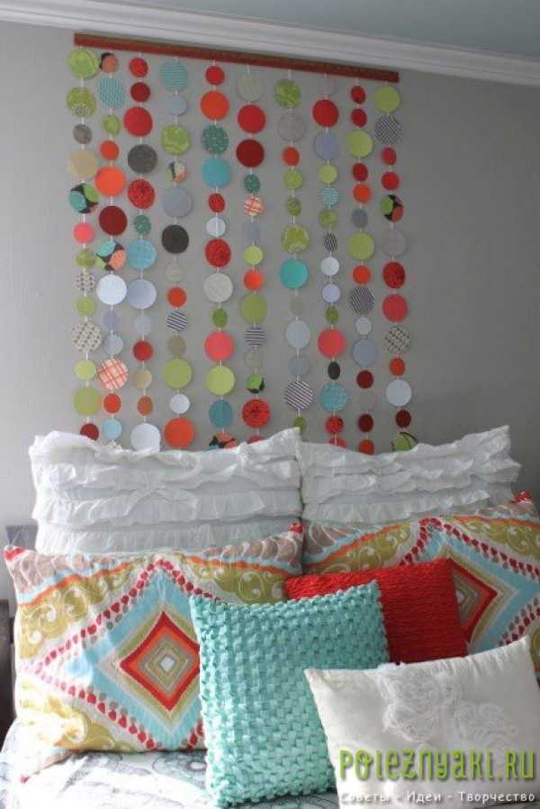 Сплетение разноцветных и узорчатых кружков над кроватью